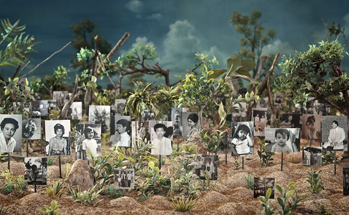 São relatos impressionantes e raros, novamente sublinhados pela insaciável busca do autor em conduzir toda uma memória em imagens, que aqui não faltam. Existe a criação dessas, nem que seja pelo diálogo direto da fotografia, as únicas provas de vidas passadas e obliteradas. São pessoas exclusivamente para serem “espancadas e deitadas foras” (o termo segregativo de Vay Tchaol), prisioneiros de quotidianos forçados que as reduzem a objetos viventes, arrastados por uma automatizada noção de sobrevivência (os avisos quanto à necessidade de “comer carne para sobreviver” que levam a não intencionais atos de canibalismo) e contidos aos seus “mundinhos” de miséria (quando o sal se torna a traição de um grupo de subsistência). Elementos que vão contaminando a poesia atentada de Panh que avança em paralelo por cemitérios sem dono, ao encontro de espíritos condenados a uma eternidade em vão. E por entre as florestas, que o próprio evidencia neste documento, habitadas por almas violentadas, as árvores sangram, as mediums choram pelos seus entes queridos e as máscaras confundem cada vez mais com a vegetação.