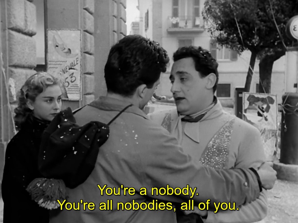 Nunca o Carnaval trouxe tais sentimentos! Alberto (o sempre grande Alberto Sordi) revira os seus olhos por entre os adereços e ornamentos daquela festa carnavalesca, aliás, fim de festa, onde só os resistentes parecem persistir nas últimas e arrastadas melodias. O seu olhar é de uma tristeza inconsolada, o de perceber que aquele evento cujas alegrias e aventuras lhe suscitou durante anos vai, ao seu tempo, desintegrar-se e transformar-se numa memória. Quem sabe – nostalgia – o pretendido “amarcord” (“lembra-te”). Com “Os Inúteis” (“I Vitelloni”), a terceira longa-metragem de Federico Fellini, tornam-se mais evidentes os valores que acompanharam a sua jornada enquanto cineasta feito e emancipado com um estilo próprio e que seria imitado no futuro até à exaustão.