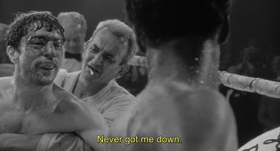 O desfecho poderia funcionar como um “My Way” de Frank Sinatra. A despedida antes das cortinas assumirem o palco, resultando na confissão, sem a devida absolvição do seu próprio carácter. Anafado (De Niro engordou 25 quilos para representar o pugilista reformado), para relembrar o quão distante está da outrora estrutura de atleta, o agora comediante LaMotta, de frente ao espelho do seu camarim, completa o seu monólogo – “I coulda been a contender. I coulda been somebody, instead of a bum, which is what I am, let’s face it” [“Poderia ter sido um competidor. Poderia ter sido alguém, ao invés de um vagabundo, que é o que sou, vamos encarar isso”] – a citação direta de outro clássico americano, “On the Waterfront”, de Elia Kazan (1954).