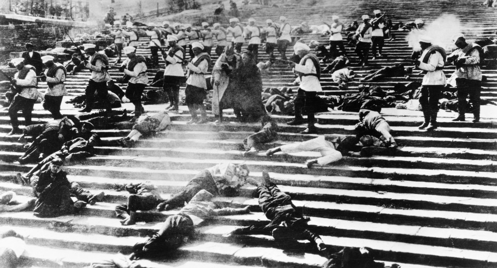 Ato célebre e eternizado da obra-prima de Sergei M. Eisenstein (1898 – 1948) – “O Couraçado Potemkin” (“Battleship Potemkin”, 1925) – a apropriação de um evento real que encontrou no cinema a sua transposição. Difícil mesmo é o de separar a História desta parte de história cinematográfica. “Aquilo que passou pelo cinema e foi por ele marcado, já não pode entrar noutro sítio”, afirmação de Jean-Luc Godard na sua série “Histoire(s) du Cinéma”, 60 anos depois da primeira projeção oficial do filme de Eisenstein. Ainda hoje, a escadaria de Odessa, imortalizada na obra e que nenhuma relação teve com o verídico motim, é curiosidade turística aos estrangeiros-passageiros, provando que Lenin tinha razão em apostar na “mais jovem das artes” para servir de porta-voz à sua implantada ideologia. E a cena descrita anteriormente é uma prova desse estandarte visual que o cinema assumiu, a transcrição e tradução da História, atribuindo-lhe uma conotação desejada e para essa “maquineta” operar, uma engenharia teve que ser aprimorada e aperfeiçoada.