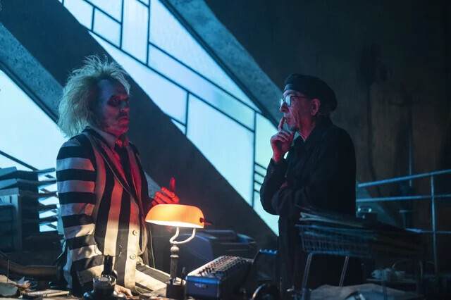 “Beetlejuice Beetlejuice” é de matéria diferente, é um filme para estúdio, não há que negar, mas ostentando uma liberdade que quem, como Burton, ofereceu estilismos, maneirismos e estéticas adaptáveis aos mercados. Aí, a Warner prometeu fundos e mundos; da Netflix traz Jenna Ortega, a adição umbilical ao anterior papel de Winona Ryder, regressada, e com Michael Keaton como reprovado dessa fantasmagoria. O actor-”parceiro do crime” é novamente o demónio “bio-exorcista” que quebra a quarta parede com maior exactidão e liberdade que Deadpool (o facto daquele filme quebrar recordes em 2024 é de também quebrar o coração cinéfilo), porque não se resume a um alter-ego com mordaça corporacional e “cultura-pop atirada aos cacos,” mas sim numa possessão burtonesca. Aliás Burton fala através desse Beetlejuice, como também o filme é todo ele pontuado por uma certa raiva enfeitada num humor ácido.