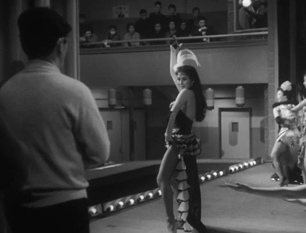 Do que nos foi apresentado até aqui, podemos recair nas artimanhas que o tempo maliciosamente opera na neblina em “O Som no Nevoeiro” ou na batalha campal de uma madrasta a tentar estabelecer laços com o enteado em “A Imagem de uma Mãe”, mas “A Dançarina” revela-se uma das jóias mais reluzentes da coroa de Shimizu. Escrita pela argumentista Sumie Tanaka (colaboradora recorrente de Mikio Naruse e autora de dois filmes de Kinuyo Tanaka: “Forever a Woman” e “Girls of the Night“), este é o enredo de uma dançarina de cabaret cuja vida é posta de pantanas pela vinda da irmã mais nova.