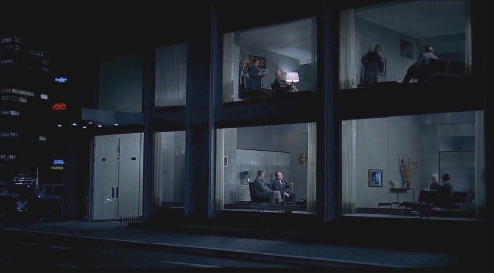 E é também a diluição das duas esferas, pública e privada, que Tati captura. Ao refugiarem-se na suposta privacidade, a luz acesa e a grande janela de vidro compõem um mosaico do edifício … Tati pensava sempre os seus filmes arquitectonicamente. Essas janelas denunciam a fragilidade da fortaleza do “eu”: pequenos ecrãs expostos, espectáculos mínimos da mundanidade. A crítica à exposição e à indiscrição modernas surge aqui, associada a uma espécie de vigilância difusa, herdeira das distopias de Orwell ou Bradbury, e das teorizações de Michel Foucault.